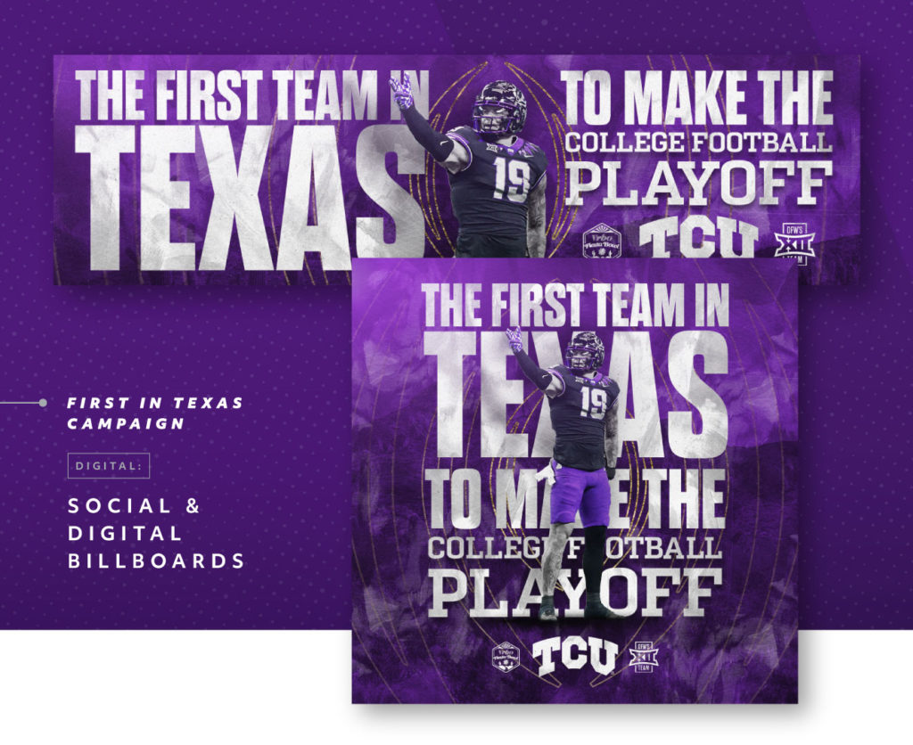Each campaign needed to build off the momentum of the TCU Football team and link that with TCU’s history as a top national university. With that in mind, TCU and Ardent developed campaigns specific for each game location that borrowed themes from the local area such as “Horned Frogs Thrive in the Desert” and “Here for a Hollywood Ending.”