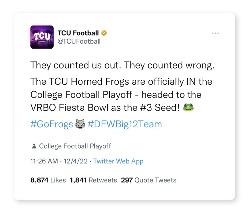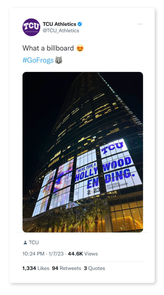 When it comes to battles between a powerhouse team and an underdog, or underfrog in this case, the underdog is typically the center of attention. Given this was a national campaign, you can bet that all eyes were on TCU, and good thing we handle pressure well. We met our deadlines, and our deliverables were shown to people all over the country. We're talking millions of people. The proof? Here it is.