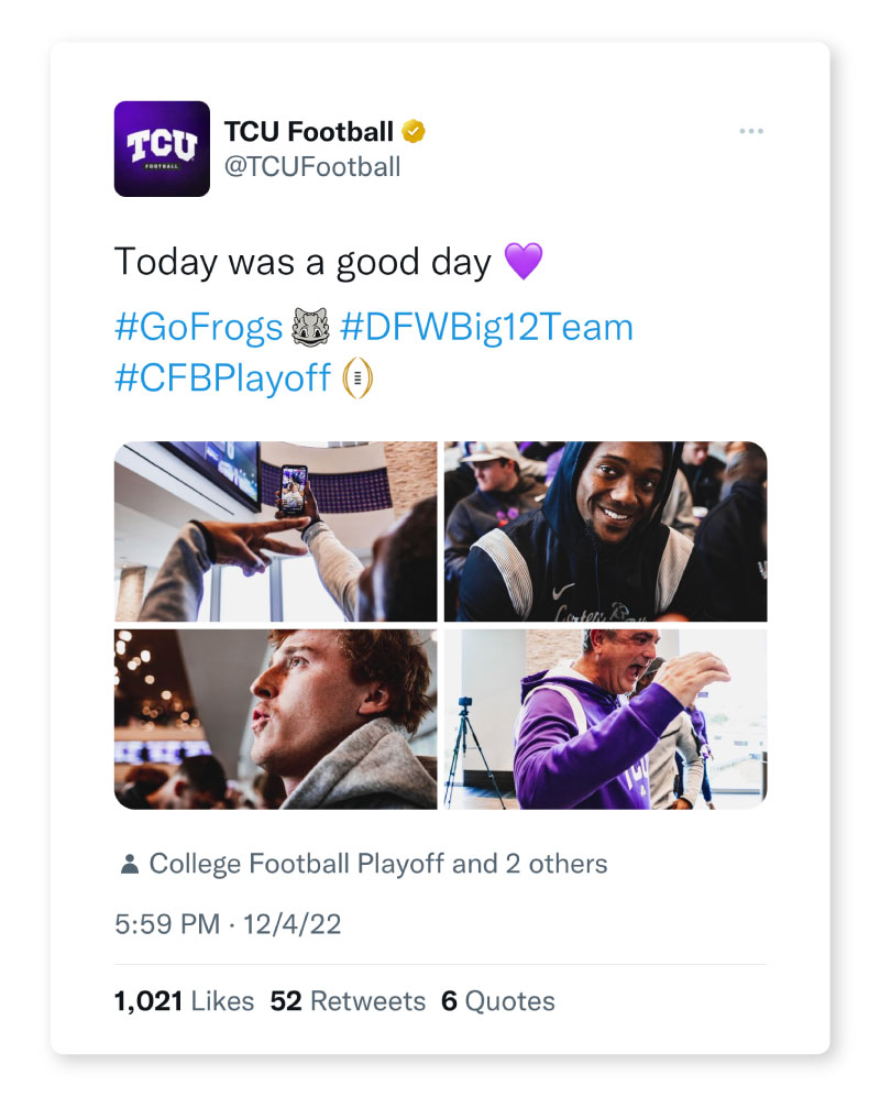 Like many local businesses in Fort Worth, we’ve been longtime supporters of the Horned Frogs. Our relationship with TCU Marketing goes back to 2001. In the 22 years we’ve worked together, we’ve produced branding campaigns, web and software development, student engagement marketing, and other various marketing campaigns that all bleed purple—Pantone 268 PMS C to be exact.