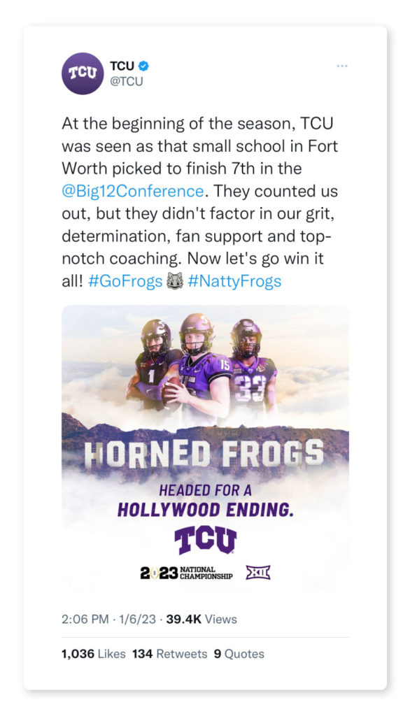 We would like to extend a huge thank you to TCU for giving us the opportunity to take part in such a historic football season. We never imagined it would end in such a historical way, and we couldn’t be more grateful for being given the opportunity to take part in it. Go Horned Frogs!