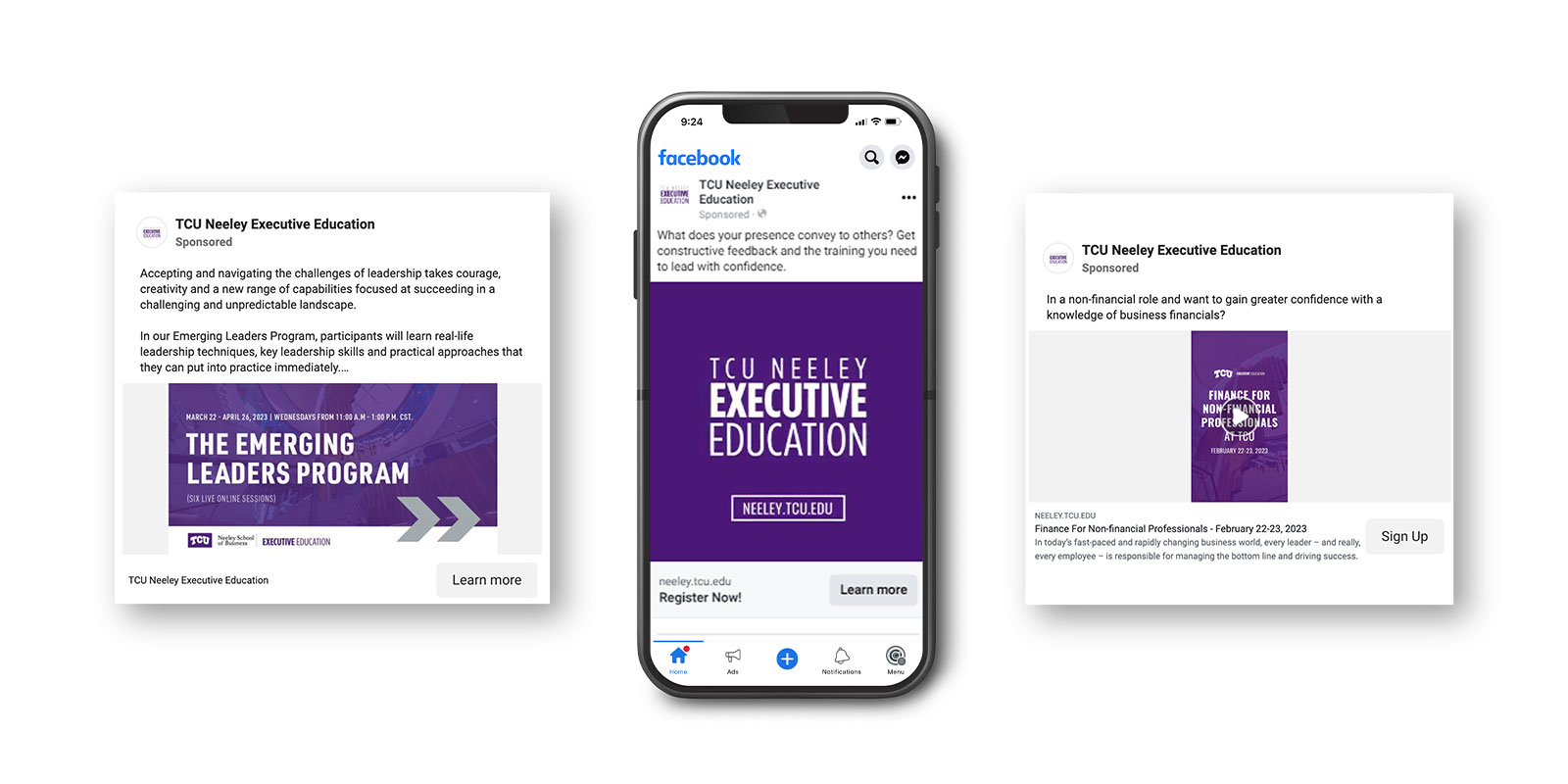 Presently, we create social media ad campaigns with weekly posts for TCU Neeley Executive Education. Our client boasts a #1 rated faculty and a variety of in-person and virtual programming aimed to serve the busy executive or professional with lifelong learning. Our social media team ensures each message is crafted with pinpoint accuracy and timed just right to reach the intended target persona. The result? We’re helping get the word out that learning never stops.
